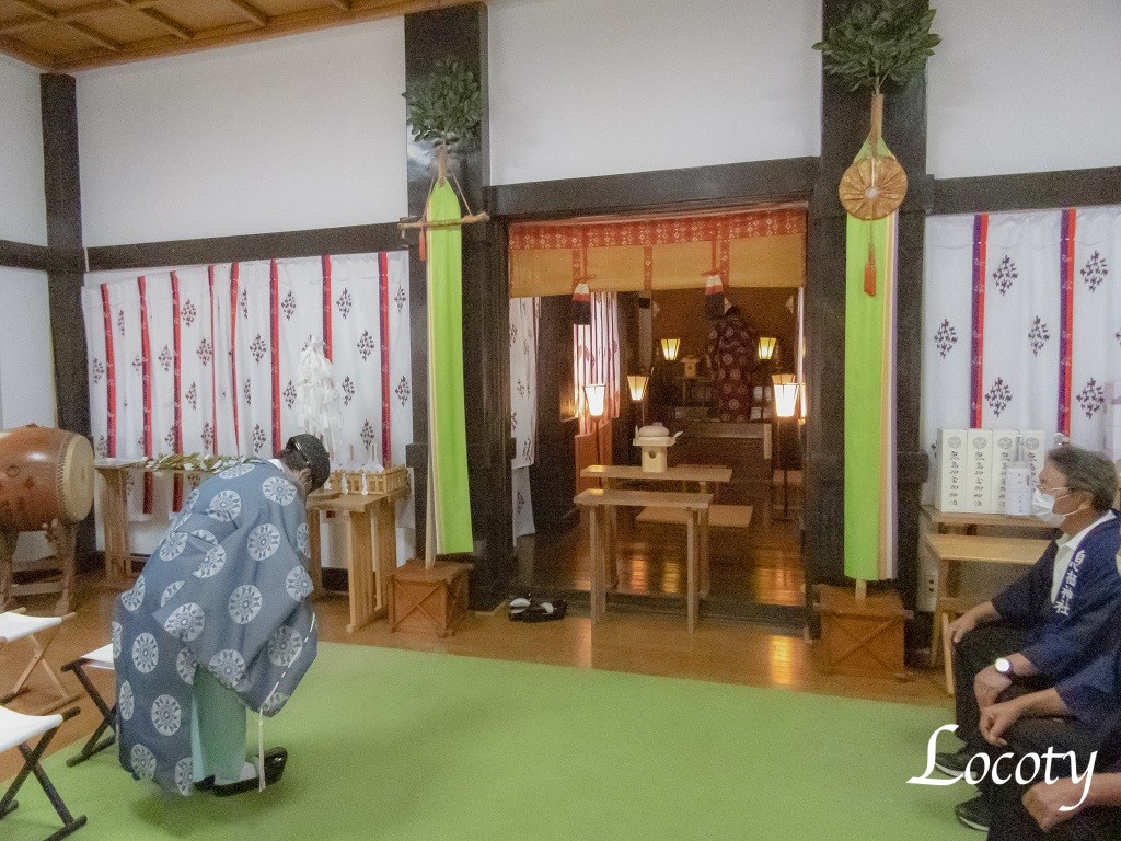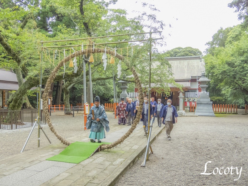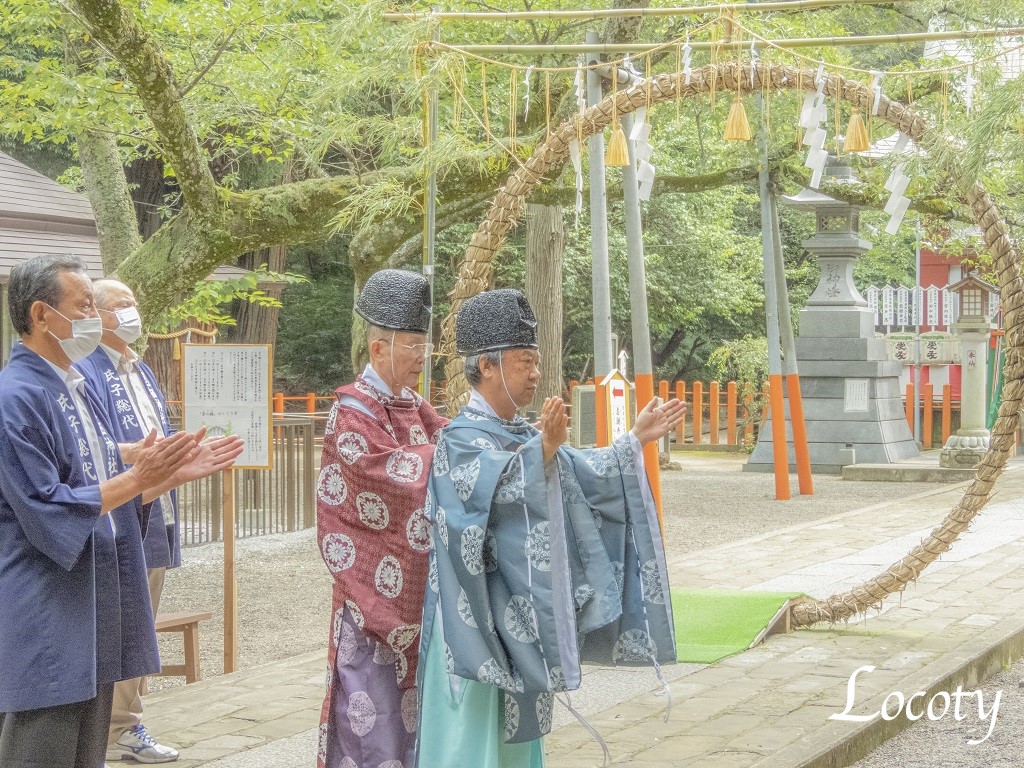 参道に設置された茅萱(チガヤ)で編んだ大きな輪(茅の輪)をくぐり、祈祷を行います。茅の輪をくぐることで、茅の輪に罪や穢れ、災厄が移されると考えられているそうです。