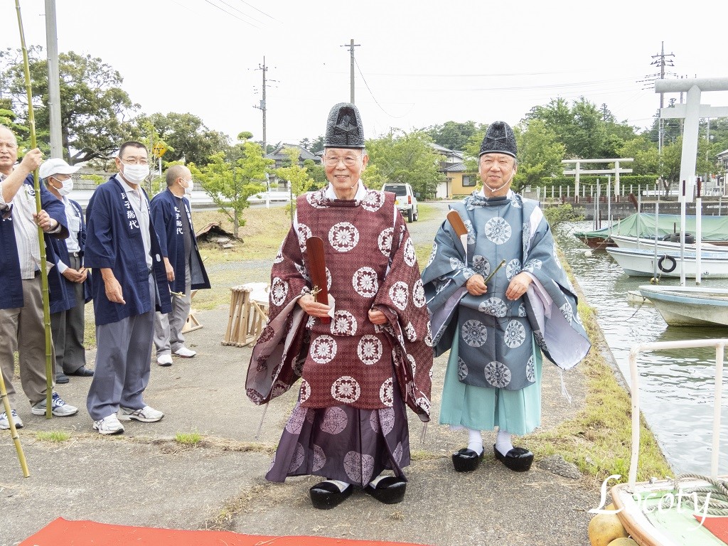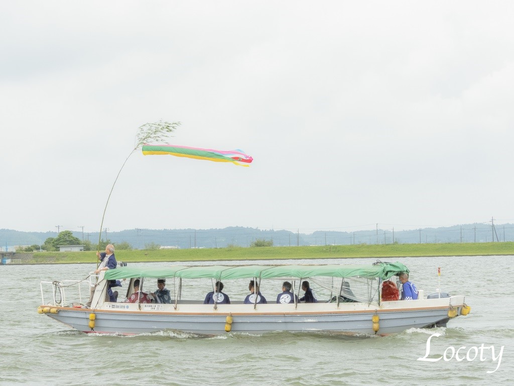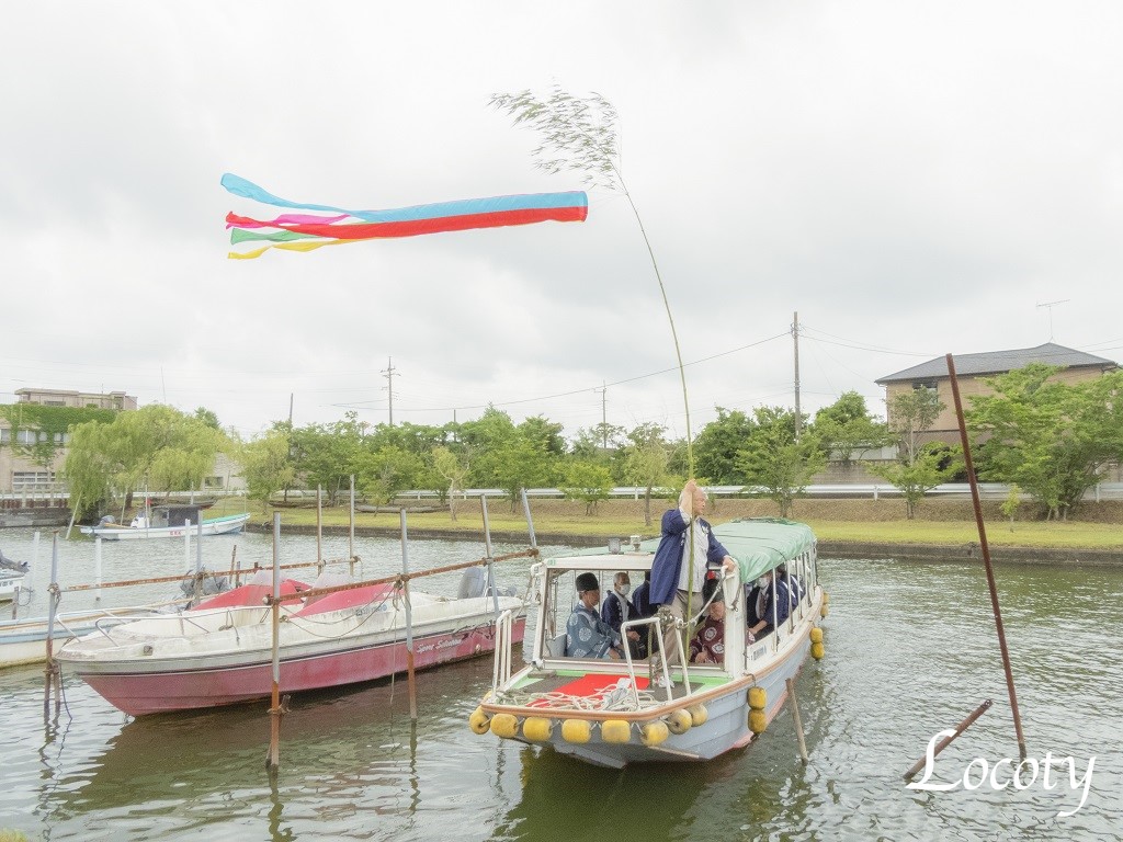 祈祷後は、常陸利根川に五色絹の吹き流しを立てた船を出し、7回半回り竹を割って川に投げ入れて、井戸・船・川の安全を願う儀式を行います。昔は神主が川に入って禊の儀式をしていましたが、現在では古式に則った儀式へと変化しています。