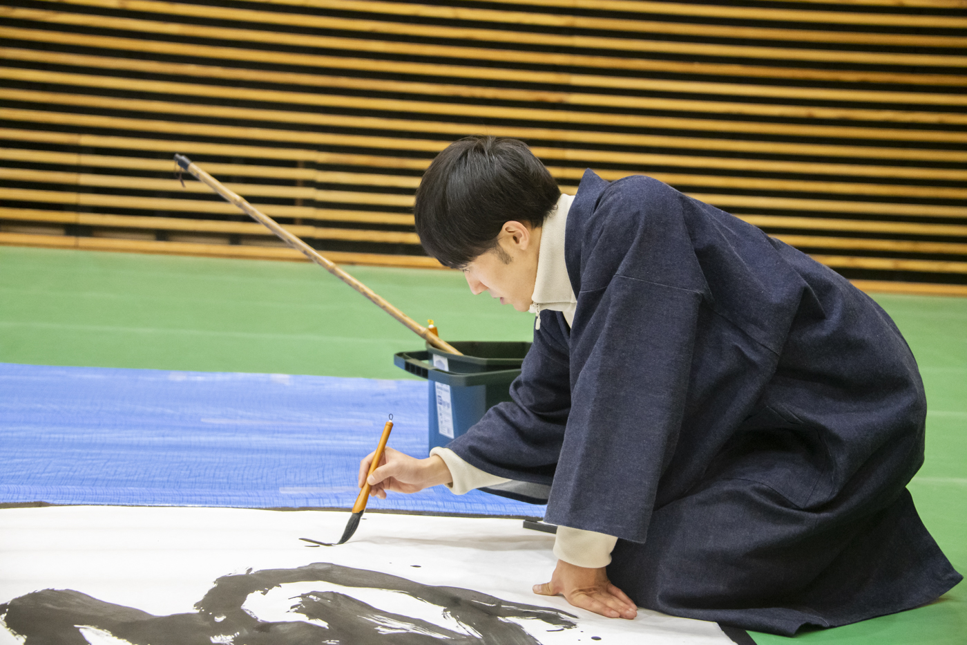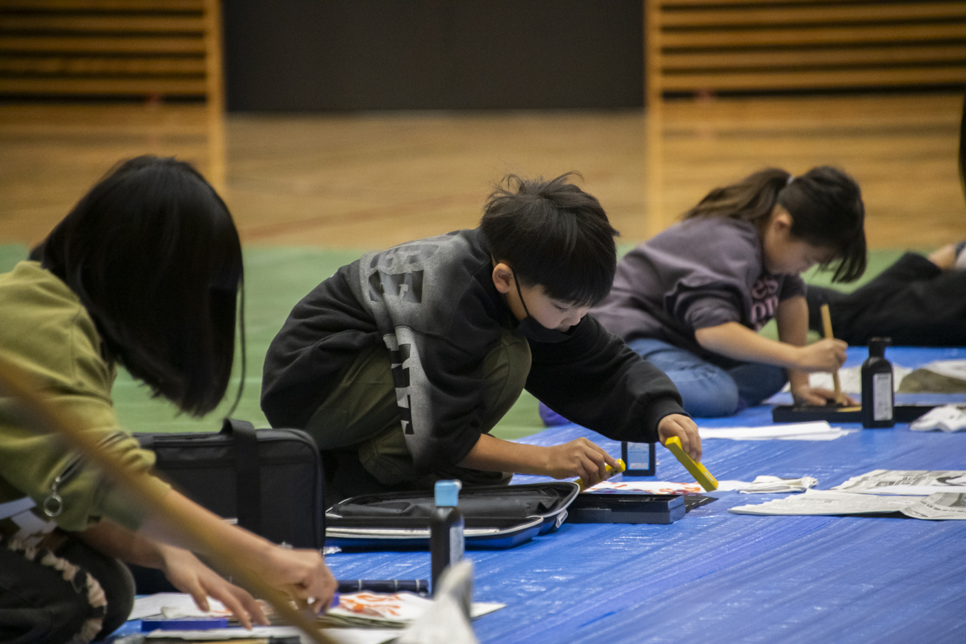 お話の後、岩井先生が実際に書を書く「書道パフォーマンス」が始まりました。まるでモップのような大きな筆で、自由自在に書を書く先生の姿に大人も子どもも興味津々でした。これほど間近で「書道パフォーマンス」を見られる機会は、なかなか無いのではないでしょうか。大迫力のパフォーマンスを間近で見た子ども達は、どうやら創作意欲がかき立てられたようです。