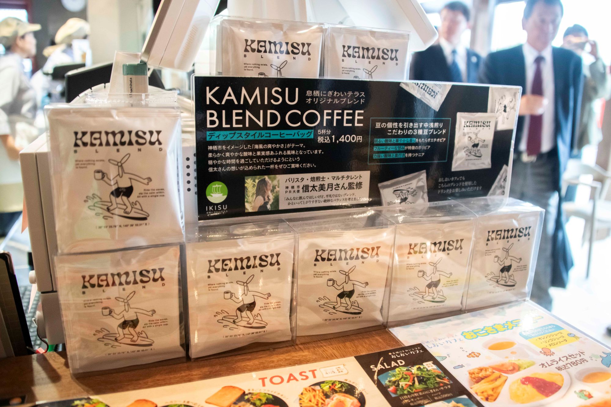 1階にある「おしおいカフェ」では、神栖市PR大使でバリスタ・焙煎士・マルチタレントでもある信太美月さんが監修したオリジナルブレンドコーヒー「KAMISU BLEND COFFEE」が販売されています。