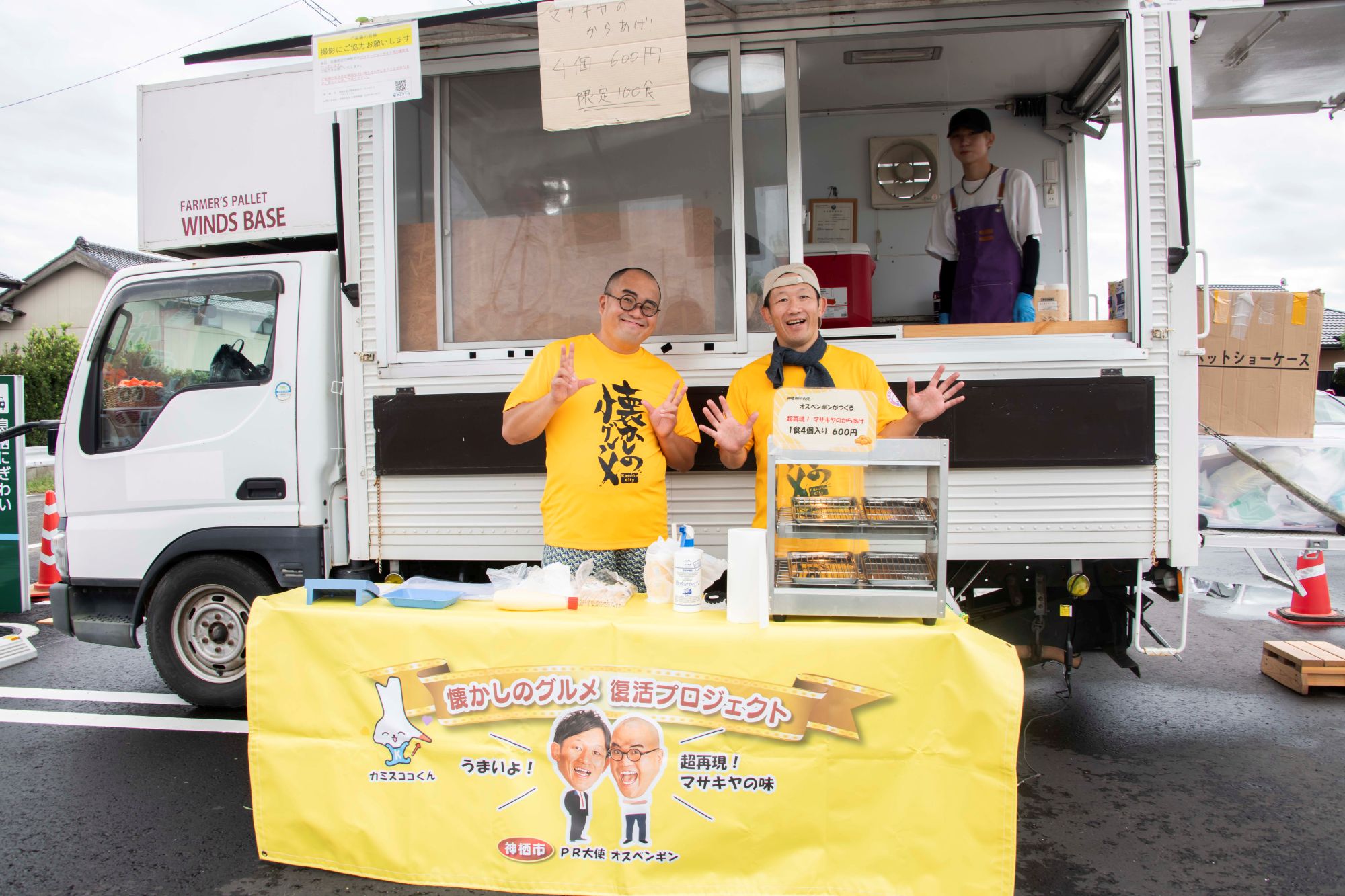 神栖市PR大使の「オスペンギン」のお二人は、「息栖にぎわいテラス」でマサキヤのからあげを販売していました。