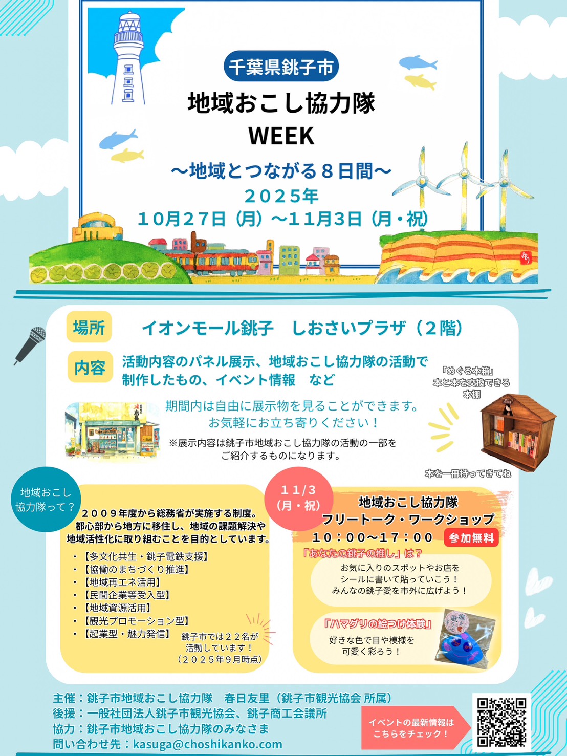 イベントでは、銚子市の地域おこし協力隊の活動内容のパネル展示や制作した物などを展示します。最終日の11月3日には、地域おこし協力隊との交流イベントやハマグリの絵つけ体験も開催されます。