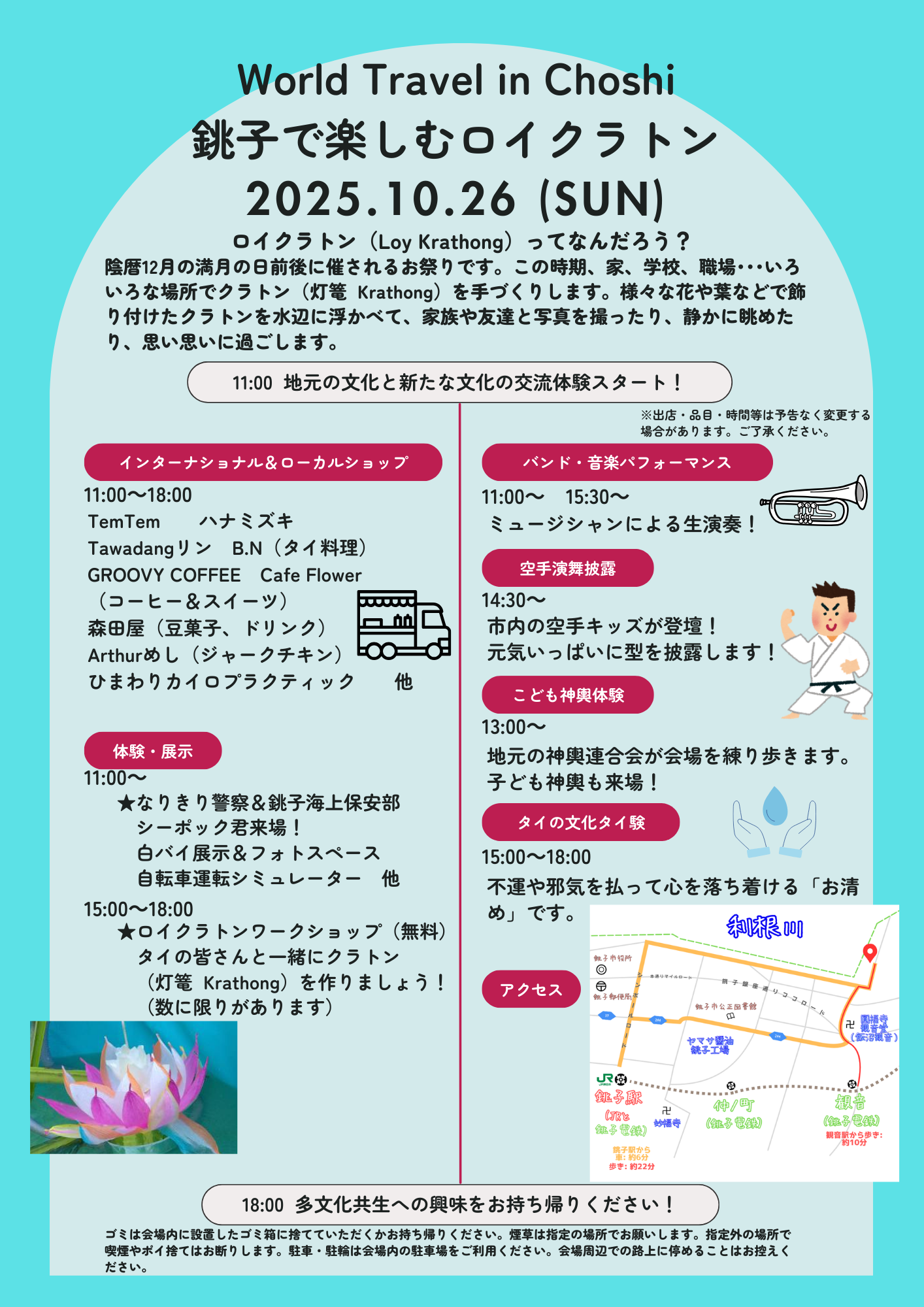 当日は、灯籠を川に流すタイの豊穣への感謝と祈りの祭事「ロイクラトン」が行われます。タイの灯篭を作って浮かべるワークショップや、タイ仏教によるお清めなどの体験などもあります。また、タイ料理をはじめ、地元や近隣から各種料理が出店します。