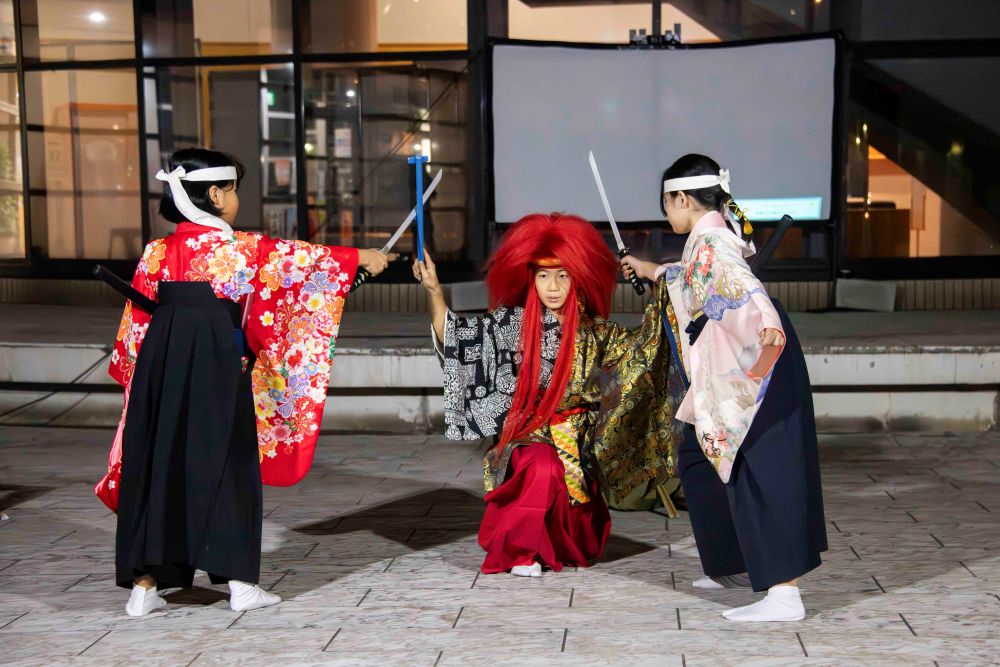 次に観世流能楽師・八田 達弥さんが神栖市の神之池に伝わる民話を題材にして書き下ろした「神之池の大蛇」が、今回初めて披露されます。地域の物語を舞台芸術として蘇らせ未来へ受け継ぐ、まさに地域と伝統が出会う特別な演目です。赤い髪の大蛇役を椎名 達希さん、武士役を保立 夏緒さん、郎等役を保立 玖海さん、郎等役を花房 栞子さんが演じました。
