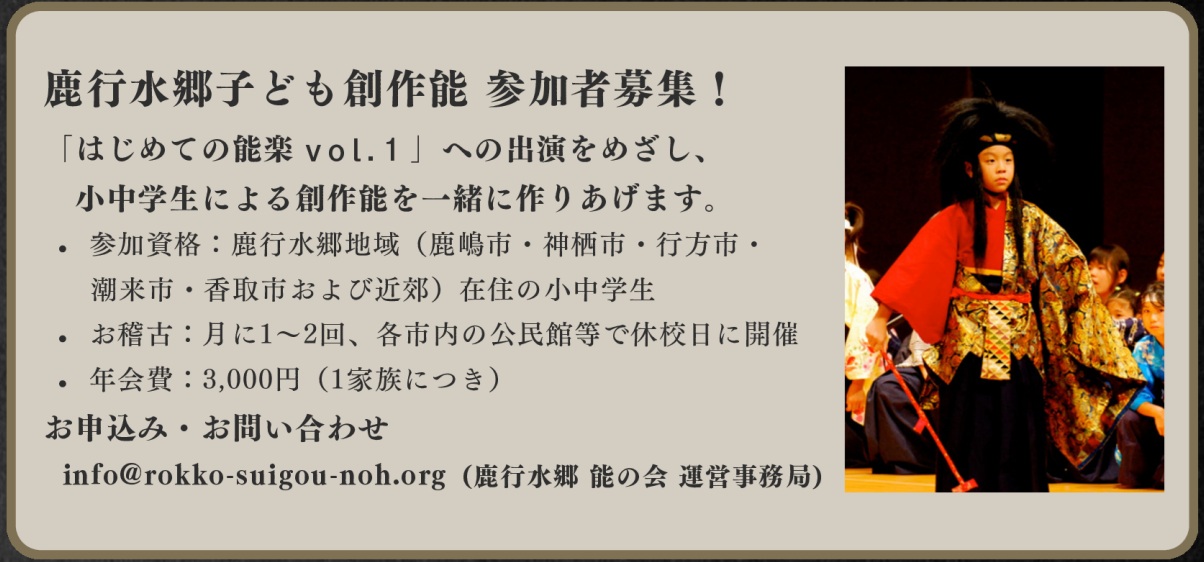 現在、鹿行水郷地域の子ども達が参加する「鹿行水郷子ども創作能」では、能楽を学びたい鹿行水郷地域在住の小中学生を募集しております。令和8年(2026年)1月24日(土)にかみす防災アリーナで開催予定の「はじめての能楽 vol.1」で披露される創作能への出演をめざして月に1~2回お稽古を行います。以下のメールアドレスまで、お気軽にお問合せください。