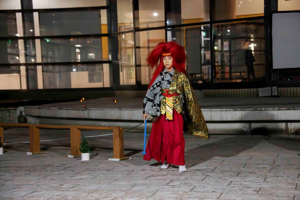 次に観世流能楽師・八田 達弥さんが神栖市の神之池に伝わる民話を題材にして書き下ろした「神之池の大蛇」が、今回初めて披露されます。地域の物語を舞台芸術として蘇らせ未来へ受け継ぐ、まさに地域と伝統が出会う特別な演目です。赤い髪の大蛇役を椎名 達希さん、武士役を保立 夏緒さん、郎等役を保立 玖海さん、郎等役を花房 栞子さんが演じました。