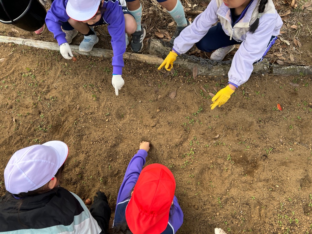 須田小学校の小学生たちは、花壇に掘られた穴の中に1個1個ていねいにチューリップの球根を植えていました。