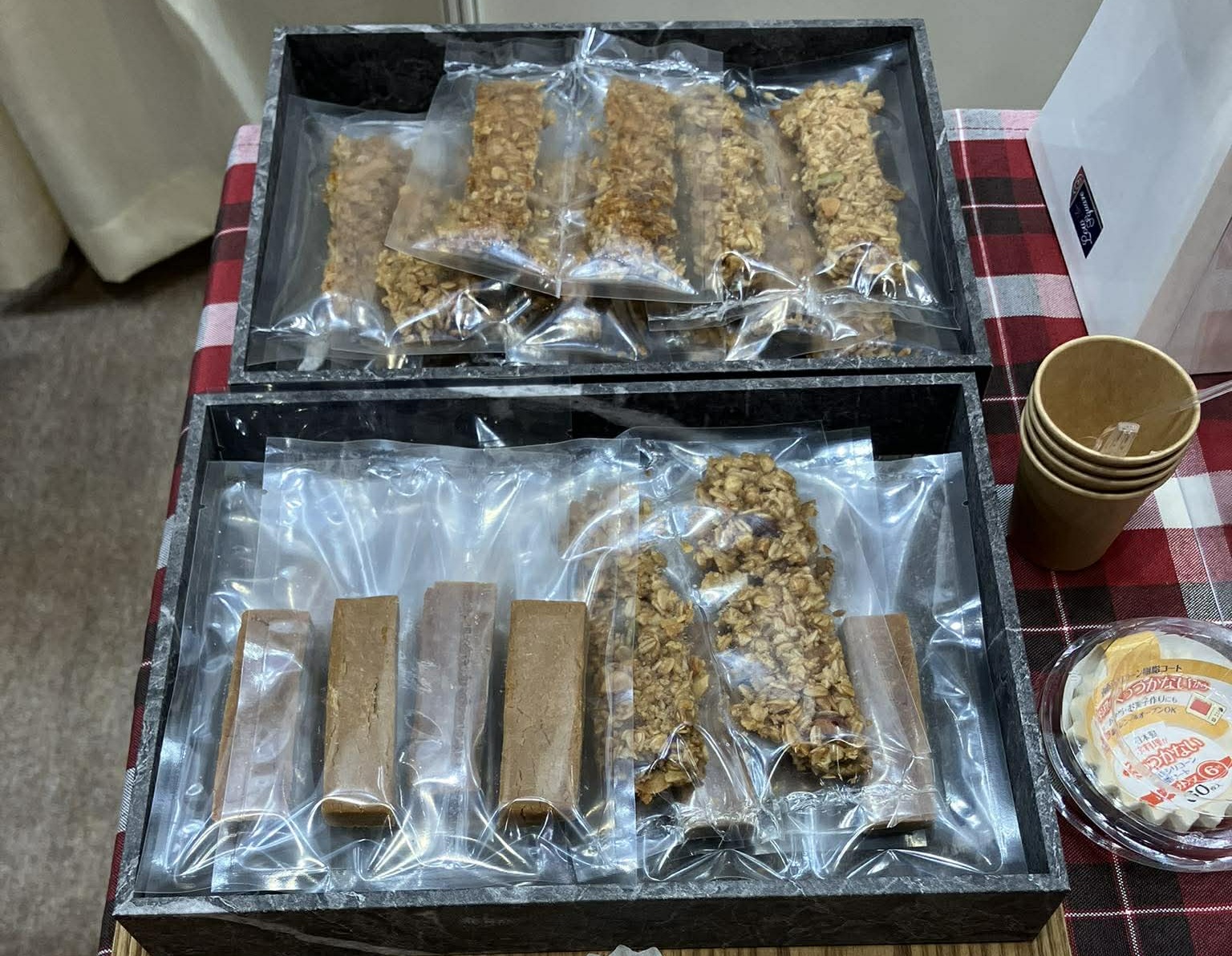 北海道産のさつまいも「べにはるか」を使った「焼き菓子」と「ナッツバー」も頂きました。素材のおいしさを活かした味わいで手軽に食べられるので、小腹が空いたときのおやつや登山のときの行動食に良さそうですね。こちらはまだ試作段階で、これから改良を重ねていくそうです。