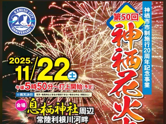 2025年11月22日(土)に茨城県神栖市の息栖神社周辺の常陸利根川河畔にて「第50回神栖花火大会」が開催されます。今年は、神栖市市制施行20周年を迎える記念の花火大会です。開催場所は、これまでの神之池緑地から息栖神…
